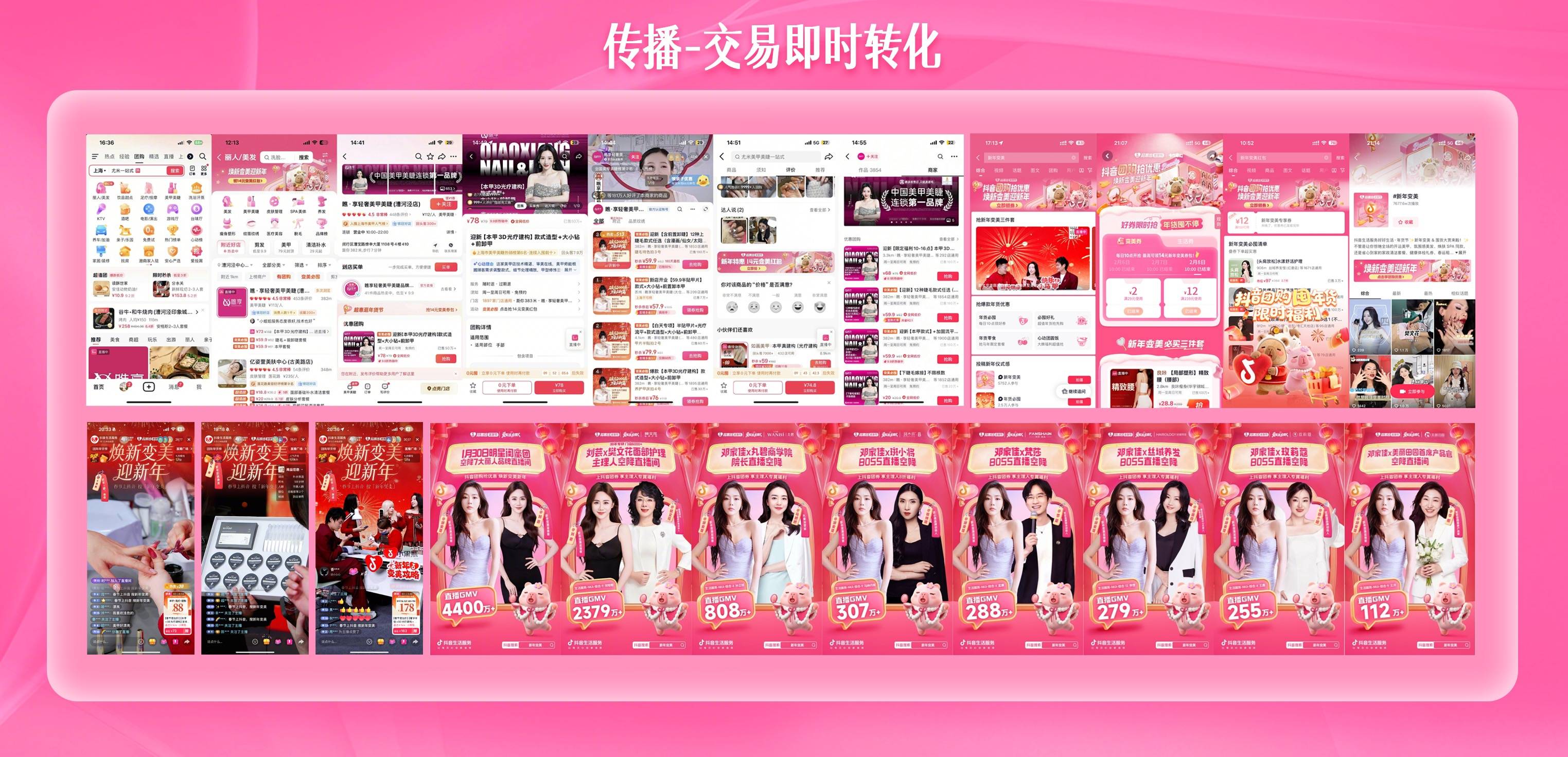 明星与头部达人们,以其影响力与专业品味,率先点亮趋势灯塔——发布趋势内容、实探趋势好品,为商品赋予“光环效应”;与此同时,抖音生活服务发起#聂小倩的开运美甲我锁死、#跟着抖音颜值天团新年美出圈、#新年我就要这样变美惊艳全场等话题,总曝光量突破579.54万次,总互动量达35.44万次。其中,#跟着抖音颜值天团新年美出圈 最高抖音热榜13名,种草榜第1名。当无数个“我”都加入这场变美实践时,新年变美趋势便从屏幕里的“他者故事”,变成了环绕每个人的 “社交氛围” 和 “聊天话题”。